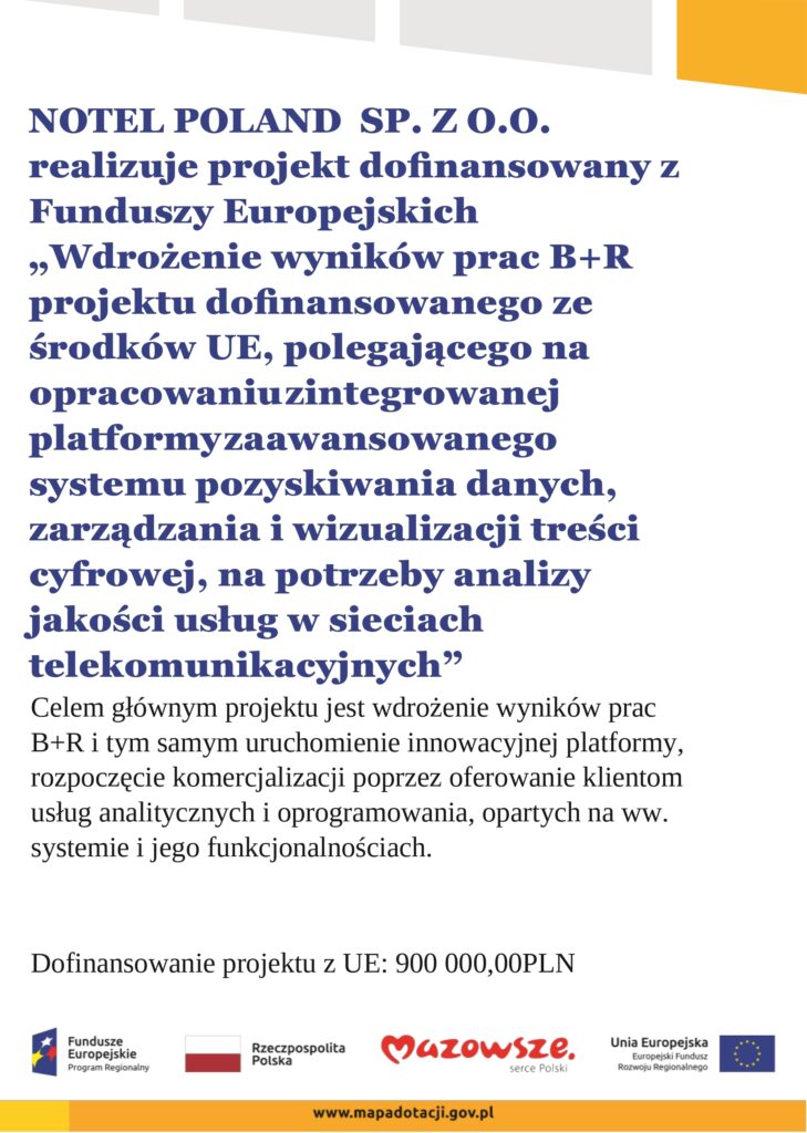 Projekt zatytułowany „Wdrożenie wyników prac B+R projektu dofinansowanego ze środków UE, polegającego na opracowaniu zintegrowanej platformy zaawansowanego systemu pozyskiwania danych, zarządzania i wizualizacji treści cyfrowej, na potrzeby analizy jakości usług w sieciach telekomunikacyjnych” jest wynikiem szeroko zakrojonych prac badawczo-rozwojowych. Jest on finansowany ze środków Unii Europejskiej w ramach Regionalnego Programu Operacyjnego Województwa Mazowieckiego (wniosek o dofinansowanie nr RPMA.01.02.00-14-9469/17). Inicjatywa ta ma na celu wdrożenie wyników badań w praktyczne, zaawansowane rozwiązania dla branży telekomunikacyjnej.